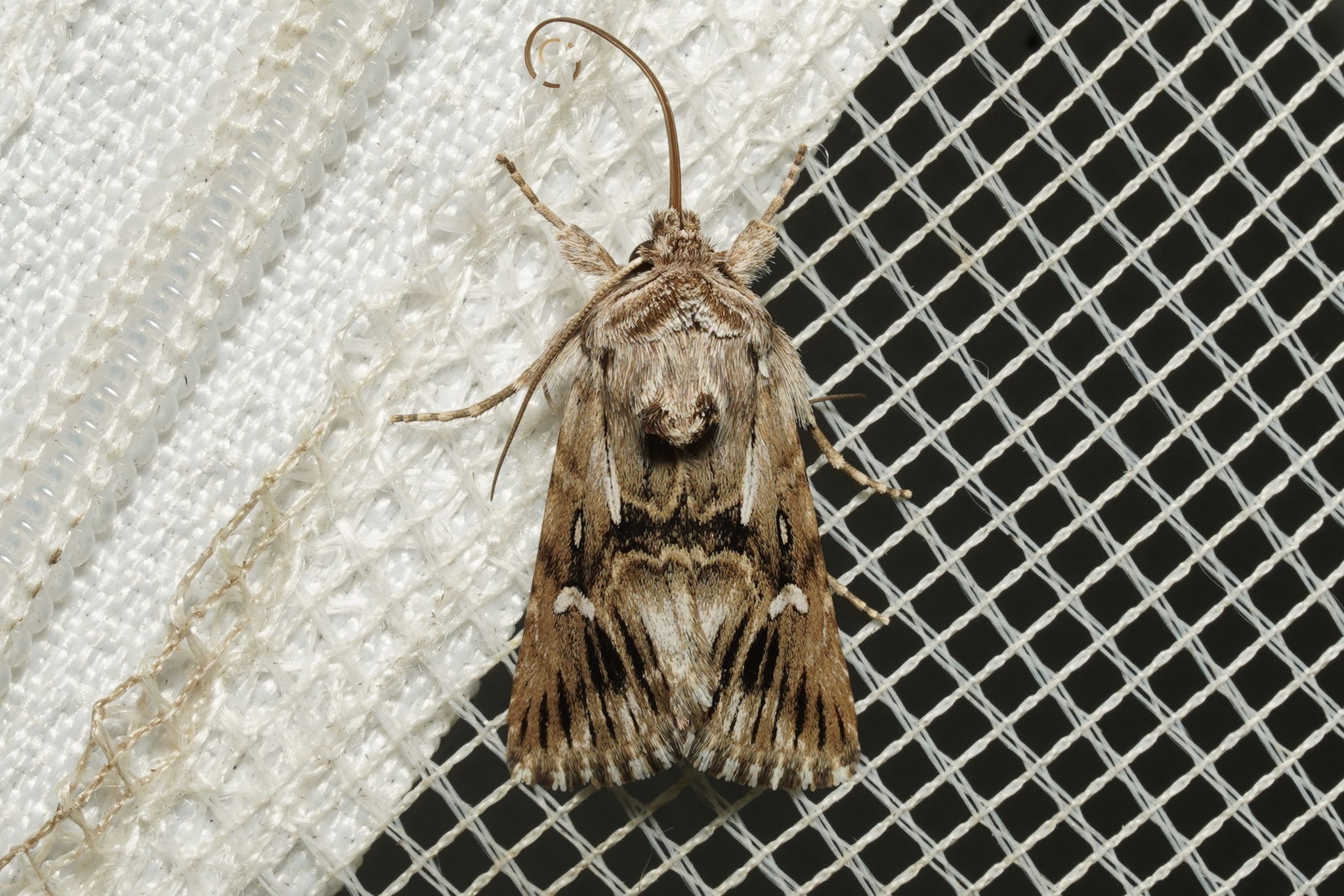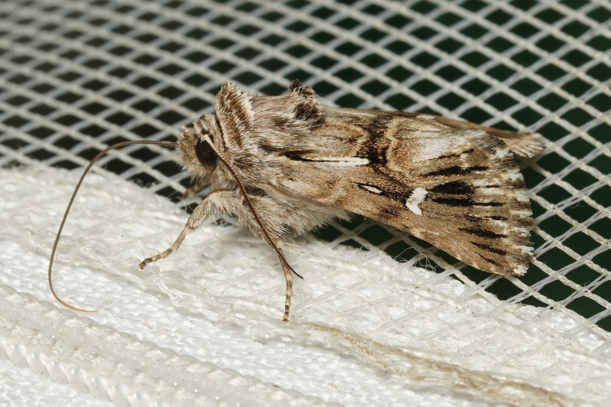 [edit]C. lunula Hufn. (= linariae Esp.) (29 b). Forewing bluish grey, suffused with olive fuscous, especially in median area and along an oblique fascia from apex to before anal angle; lines double, filled in with grey, but only distinct below middle, curved and approximating; claviform stigma elongate, bluish grey edged with black; orbicular small, flattened, white edged with black; reniform conspicuous, white with black lateral edges; some black streaks in the intervals across the oblique apical fascia; fringe chequered, olive brown and grey;hindwing dingy grey with the veins and braces of outer line darker; a smoky blackish broad terminal border. Larva bluish grey, with all the lines yellow; a dorsal series of transverse oblong velvety black blotches, and lateral series of black spots.[1] 12 millimeters long.