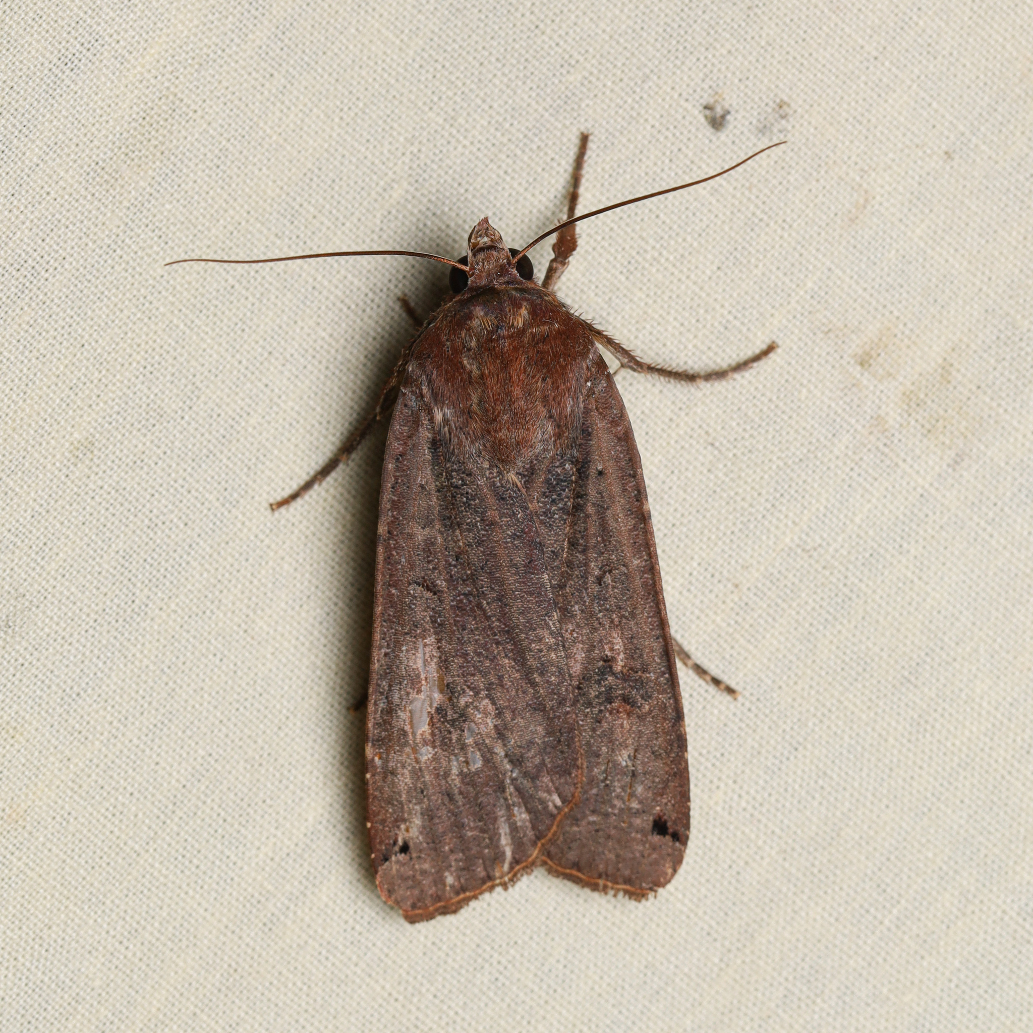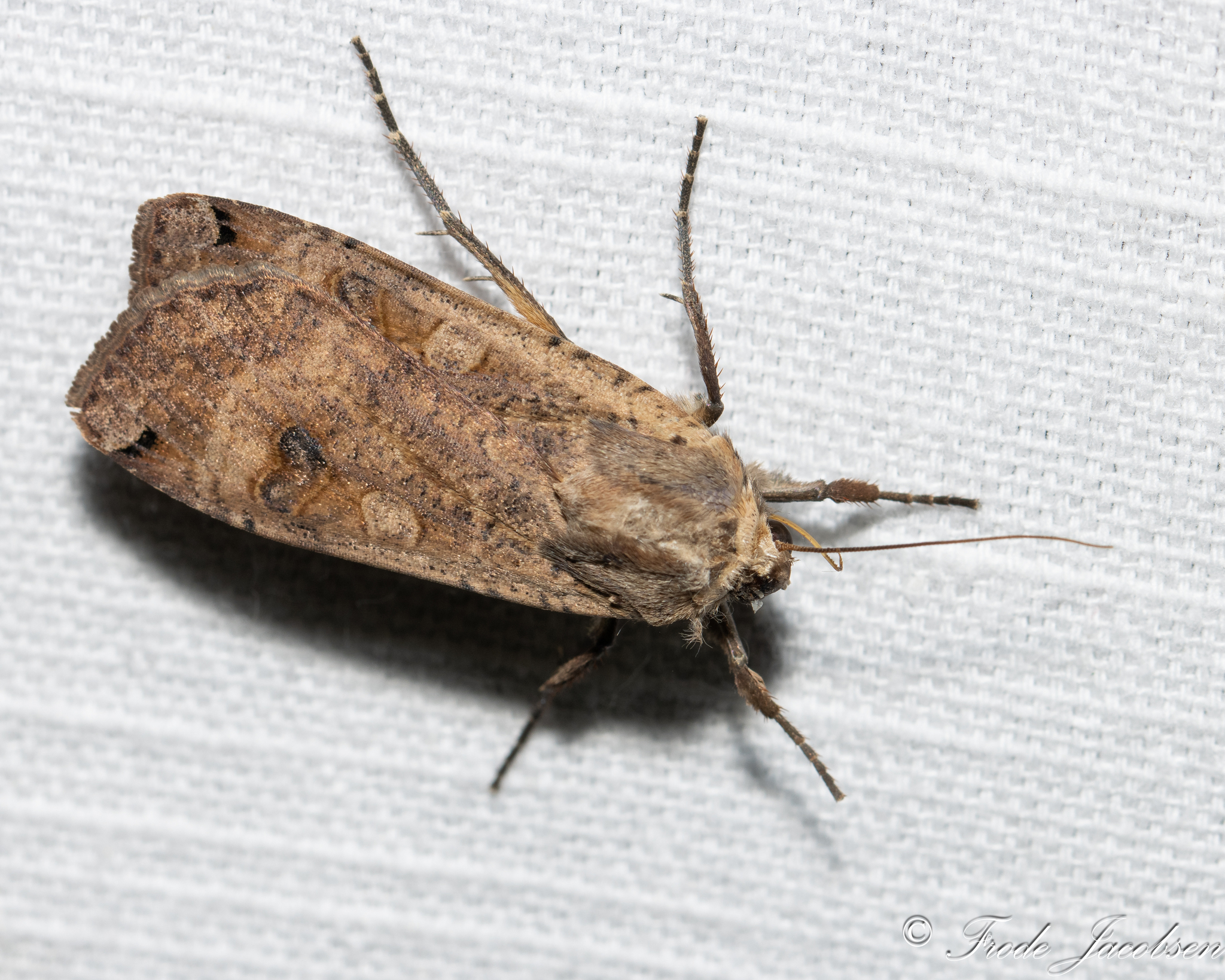 The larva is green or brown with two rows of black dashes along the back. This is one of the notorious "cutworms", causing fatal damage at the base of virtually any herbaceous plant (some examples listed below), sometimes severing it completely. This ubiquitous species is considered as a garden pest. The species overwinters as a larva and feeds on mild days throughout the winter.