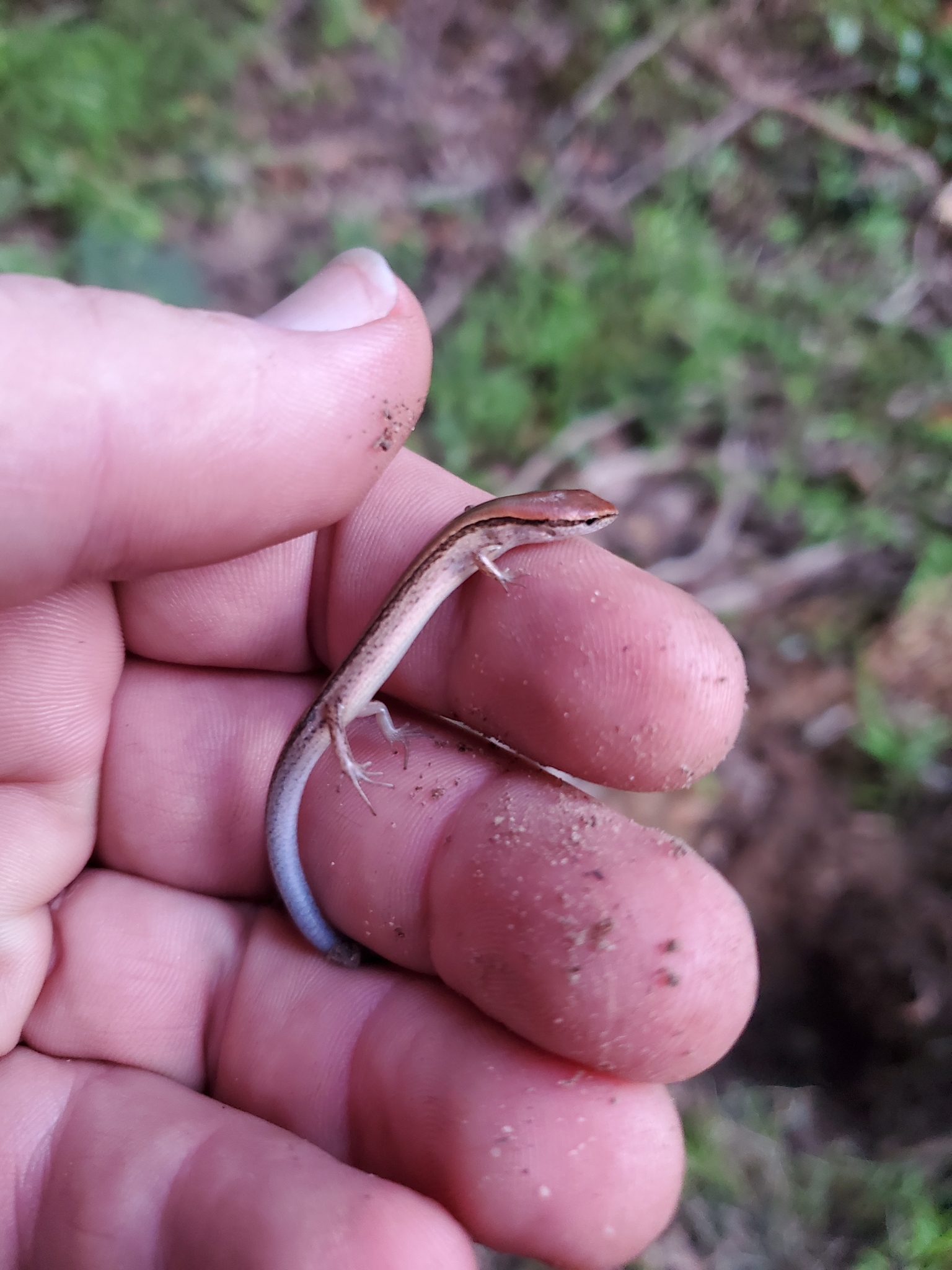 The little brown skink is one of the smallest reptiles in North America, with a total length (including tail) of only 3 - 5.5 inches (7.5 - 14.5 cm)and 1 to 2 grams in body mass. Its back is typically a coppery brown color with a white or yellow underside, dark coloration running laterally from eyes to tail [4] and like most skinks has an elongated body and short legs. Transparent disks in the lower eyelids allow it to see with its eyes closed (Beane 2006, Palmer et al. 1995). Females tend to grow faster and be larger than males.[5] Teeth size and amount for this species is more strongly correlated with snout-vent length than head size.[6] Scincella lateralis exhibits sexual dimorphism where the females are generally larger, but males have larger heads. This is suggested that this may be the result of sexual selection favoring larger heads in males in male-male contests.[7] Males heads may also become more orange in color.[8]