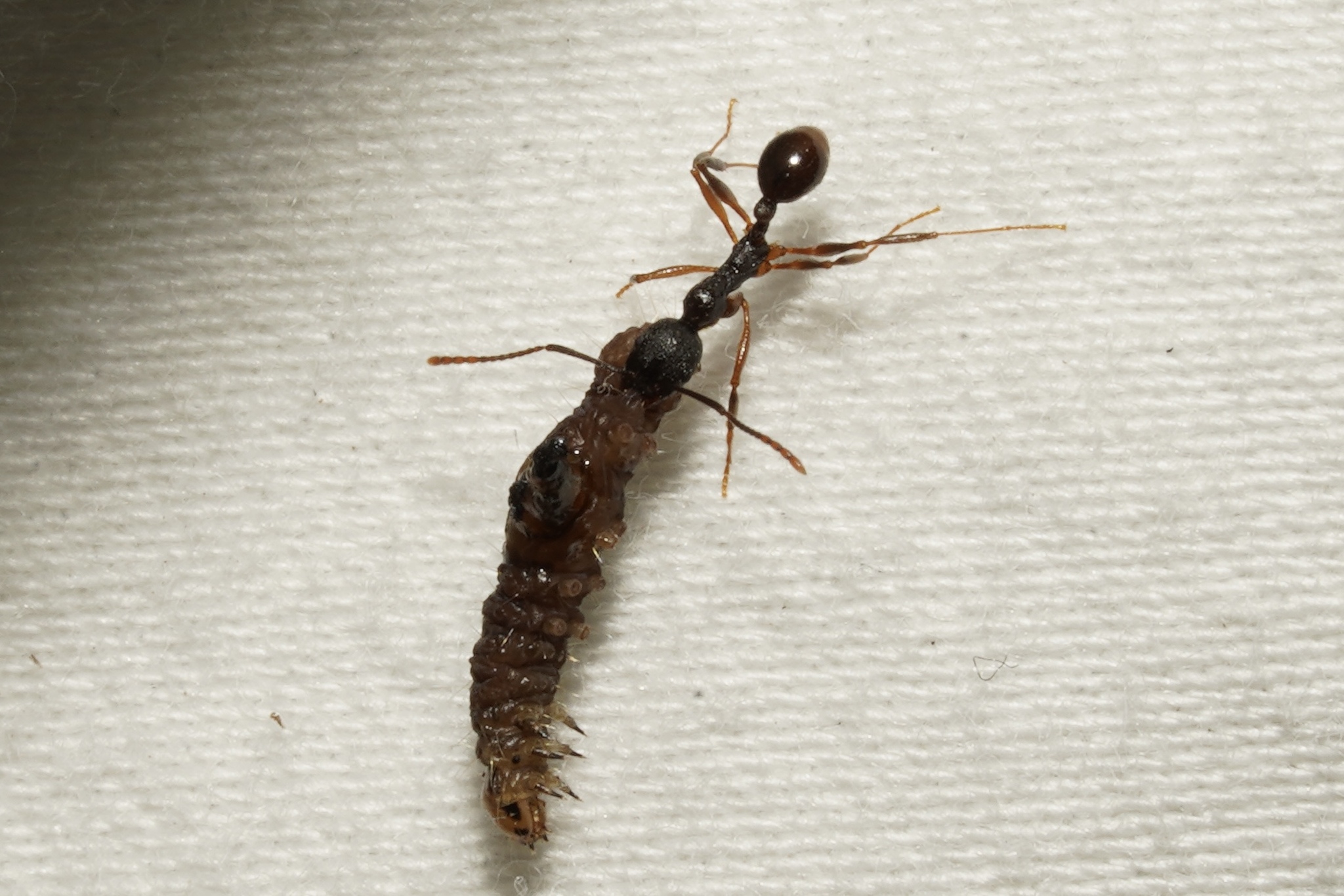 Aphaenogaster picea attacking a harvestman in Washington Co., Maryland (9/1/2017).